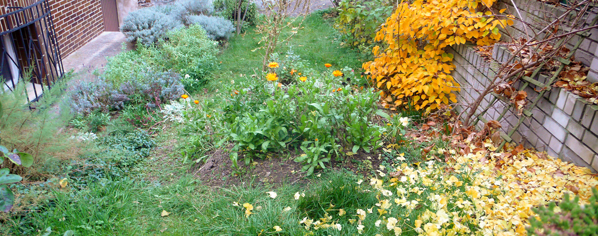 Vlevo bylinkové záhony, vpravo žlutě zbarvené listí mrazuvzdorného kiwi (Actinidia arguta), uprostřed německá kopa s porostem měsíčku lékařského.